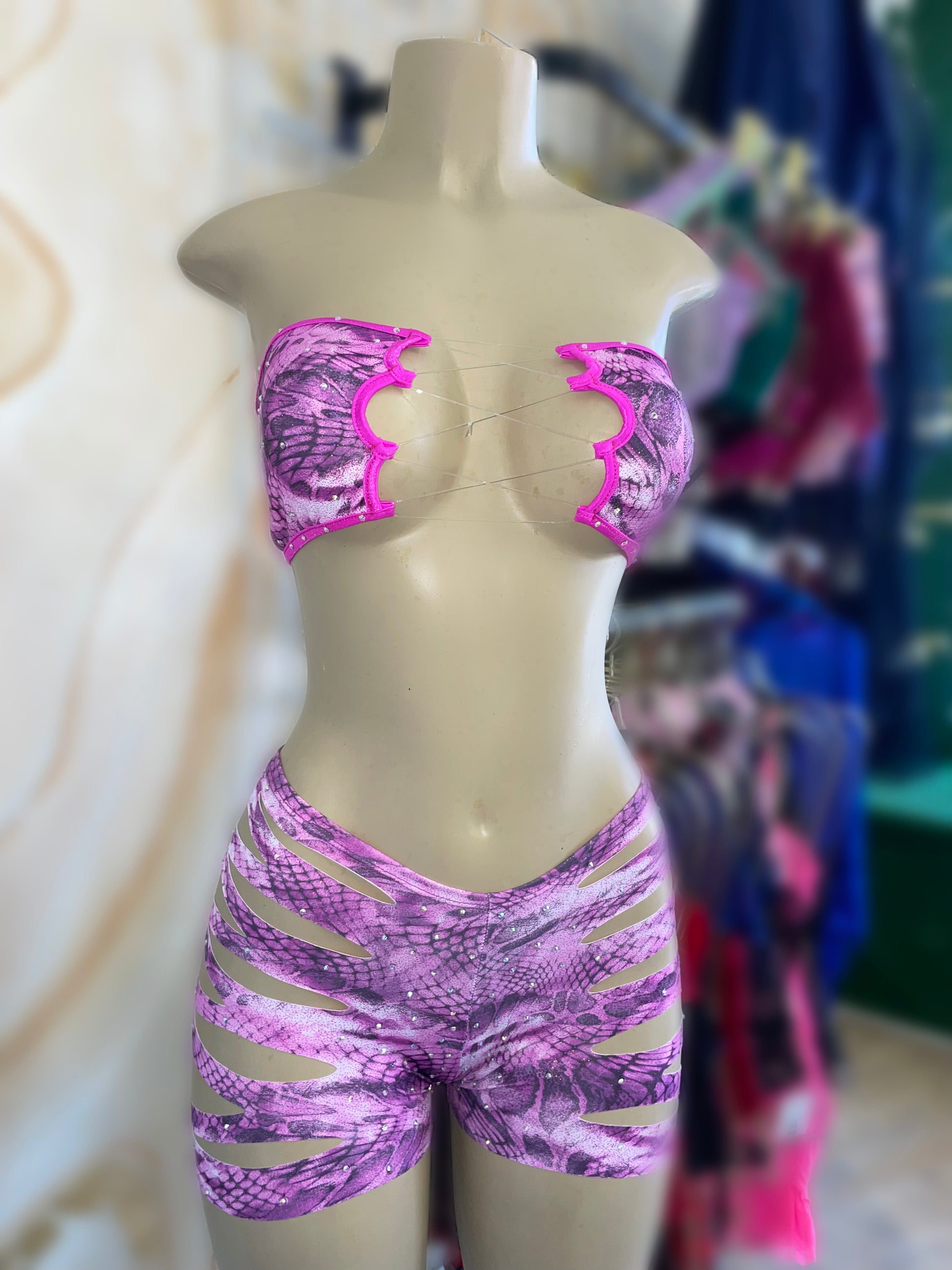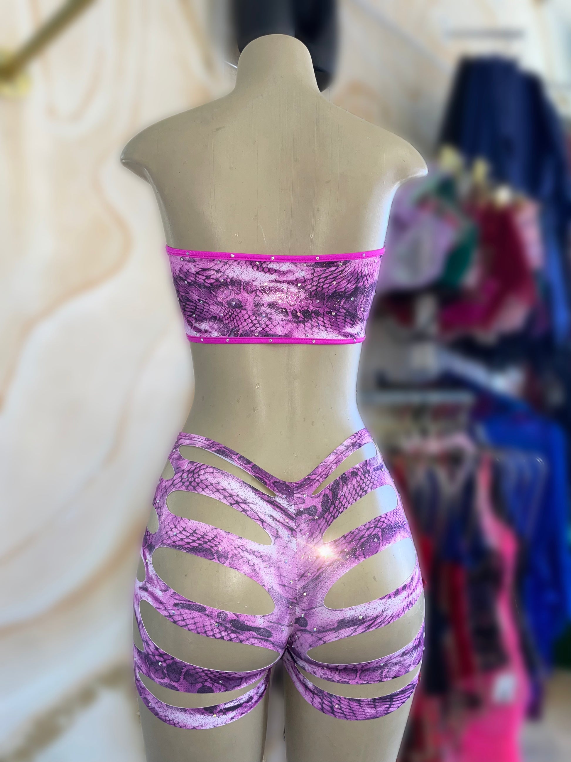 Purple snakeskin two piece short set with a front lace-up tube top, and shorts with slits that show off your curves perfectly. Covered in rhinestones, this vibrant purple snake set looks beautiful on any skin tone. Walk in to work in this and get ready to take all his money $$ and make all the girls jealous. Fits size XS-S.