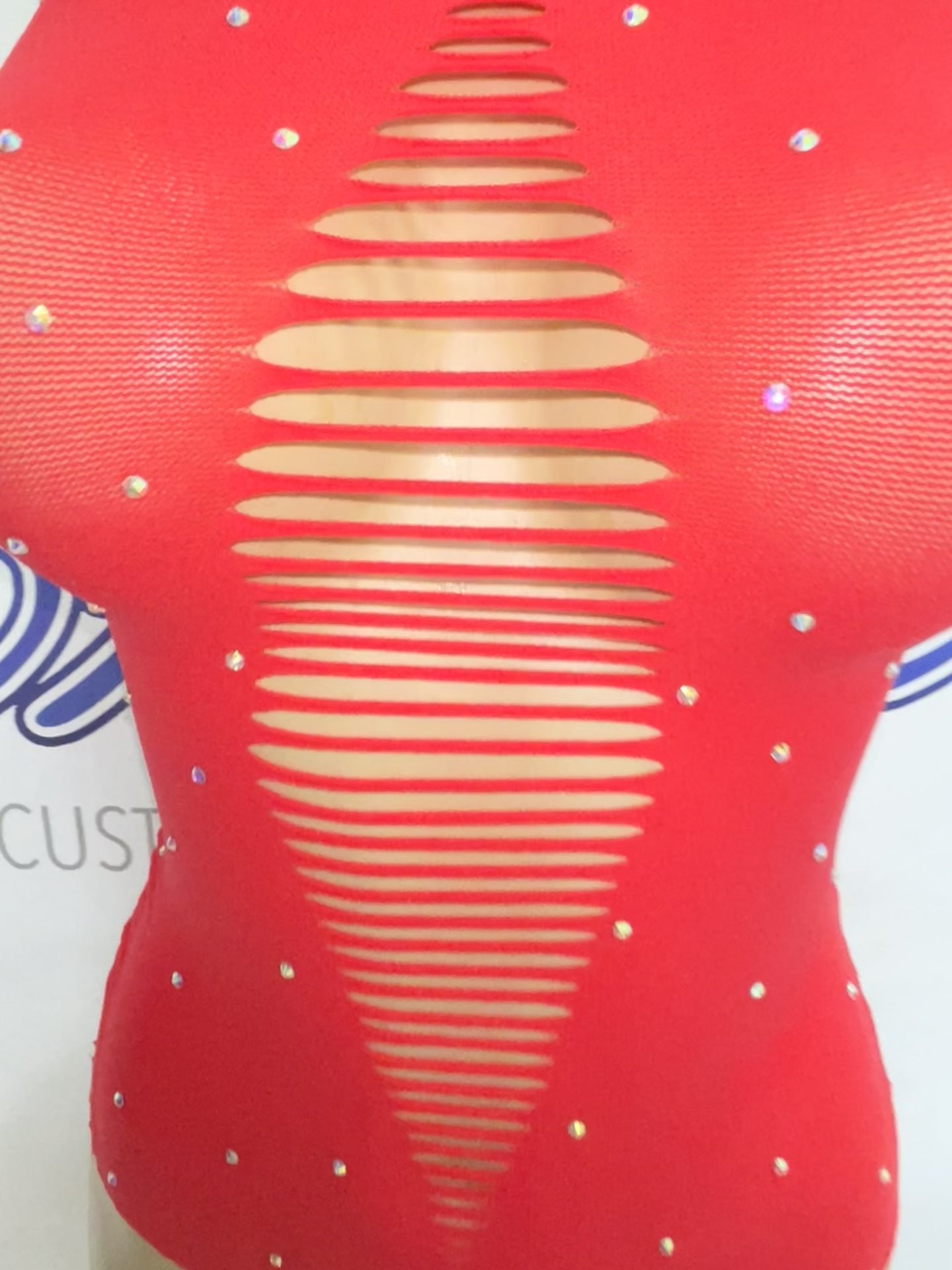 This glamorous red net one piece is adorned with shining rhinestones for an eye catching effect. It will fit small, medium, and large. The stretchy fit that will hug every curve and make you look amazing!